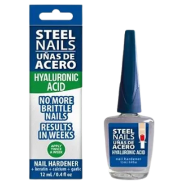 STEEL NAILS . This unique formula with Hyaluronic Acid, Calcium, Garlic and Keratin will help to improve the process of grow and prevent chipping, breaking from being brittle and weak. The Garlic will help to harder and shape nails as well to protect from fungus. Calcium is the structural mineral component of nails, so it bring to more to helps maintain the strength of nails. The unique inclusion of Hyaluronic Acid will allow that all the ingredients will get and work much better on the nails structure.