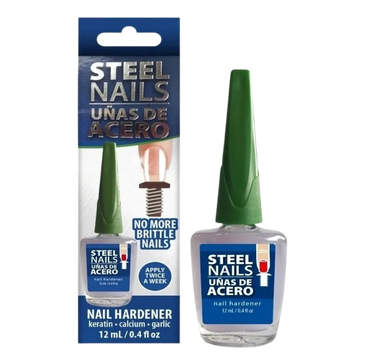 STEEL NAILS . This unique formula with Hyaluronic Acid, Calcium, Garlic and Keratin will help to improve the process of grow and prevent chipping, breaking from being brittle and weak. The Garlic will help to harder and shape nails as well to protect from fungus. Calcium
